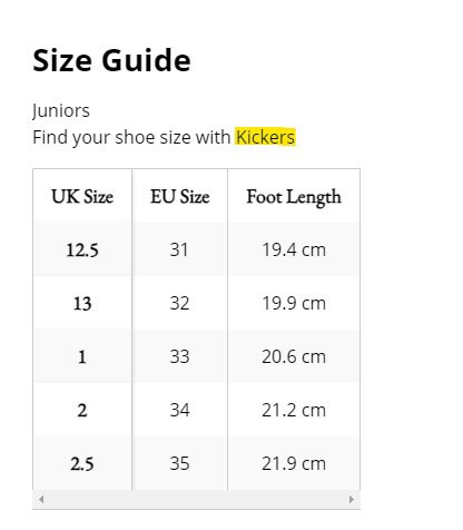 این جدول معتبر و راهنمای سایز این برند هست بنابراین اگر در اندازه گیری طول پای کودک خود دقت کنید سایز دقیق کفش کودک خود را در برند Kickers در این جدول خواهید یافت.